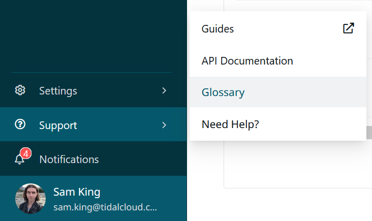 To open the Glossary, navigate to the Support menu in the left-hand navigation and select Glossary.
