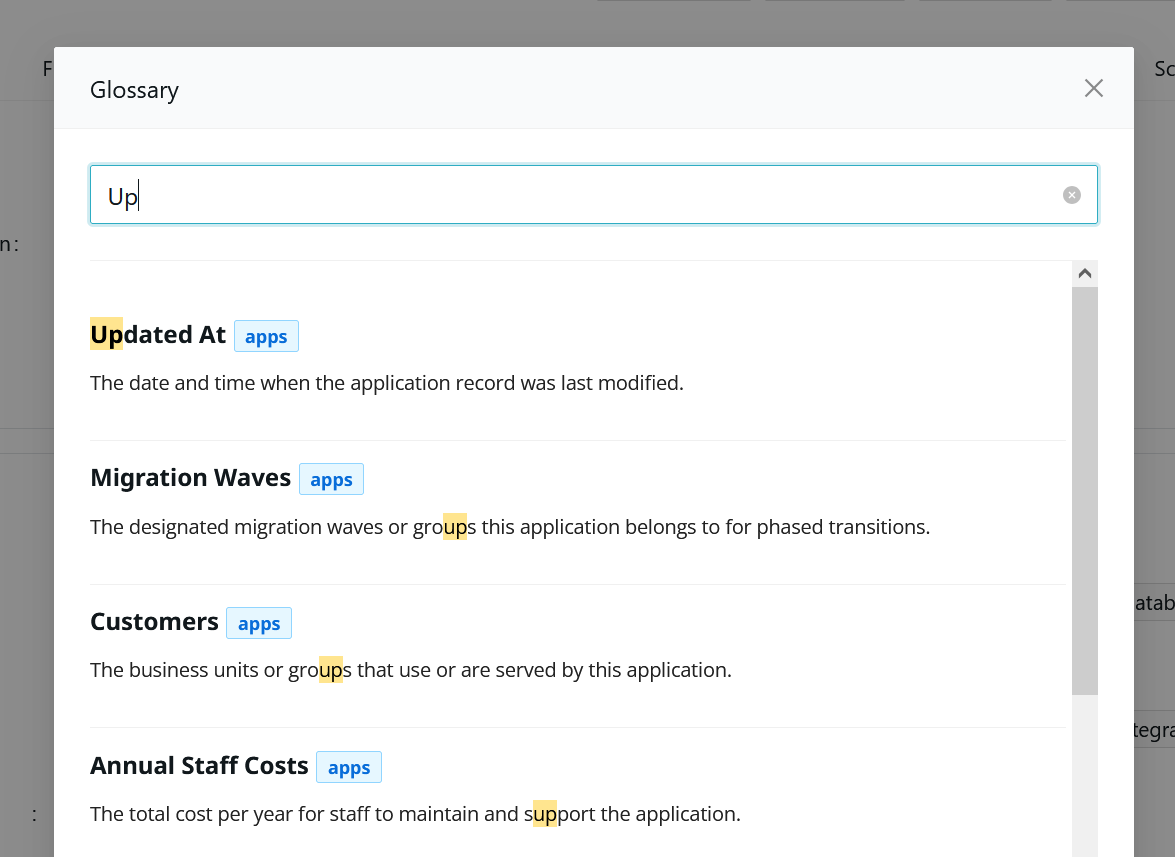 The Glossary is dynamic. When you create custom fields, they automatically appear in the Glossary along with the description you provide. This ensures that your team always has a single, up-to-date reference for every field in your environment.